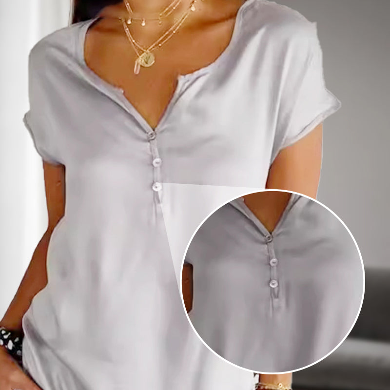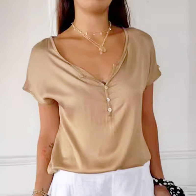 Výrazný dizajn s výstrihom do V - Zvýraznite svoj dekolt s naším tričkom s výstrihom do V z hladkej saténovej tkaniny s krátkymi rukávmi. Klasický výstrih do V vytvára lichotivú siluetu, ktorá zvýrazní vaše prirodzené krivky a predĺži dekolt.